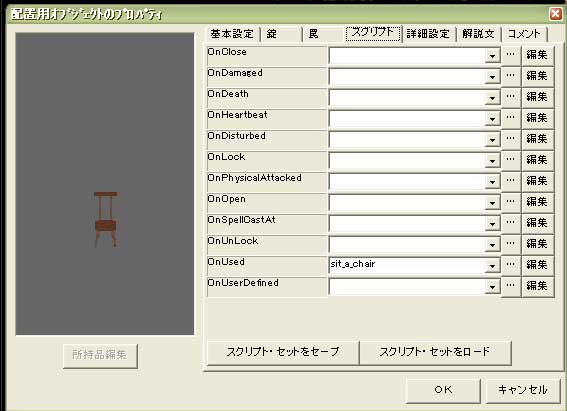 「if」の部分は、「 !GetIsObjectValid (GetSittingCreature (oChair))」で、既に座っている人がいないかどうかを調べています。