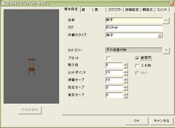 そして「椅子」のプロパティを開き、「基本設定」タグを見てみます。