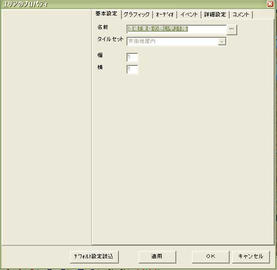 まずは、エリアのプロパティを開いて、設定を調整します。「基本設定」タグで名前が(その1)で入力した通り「Kulsy_Inn」になっていますので、ここで『酒場「黄昏の憩い亭」1階』と書き換えておきます。